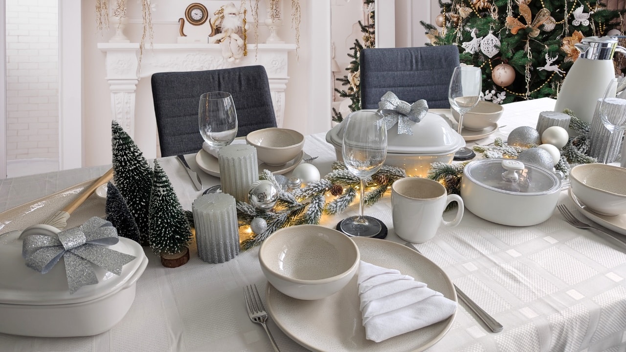Ein Tisch, gedeckt mit strahlend weißem Geschirr, glänzenden Platten und sanften Formen – so einzigartig wie die Menschen, die sich daran versammeln.