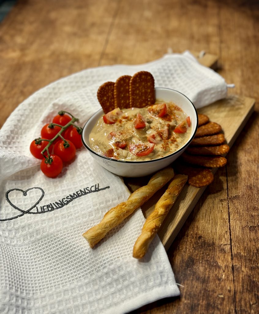 Pizza Burrata Deluxe wie vom besten Italiener! Mit selbstgemachter Tomatensauce und Pesto – belegt mit Rucola und Serrano Schinken.