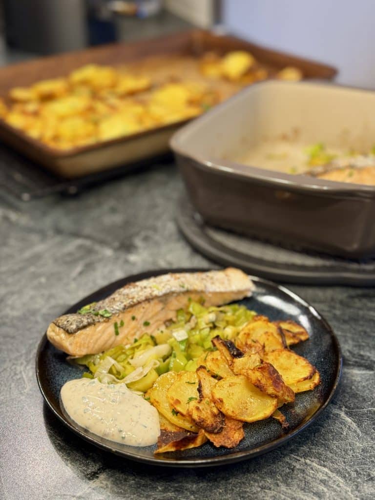 Saftiger Lachs mit Porree und knusprigen käsigen Bratkartoffeln aus dem Backofen