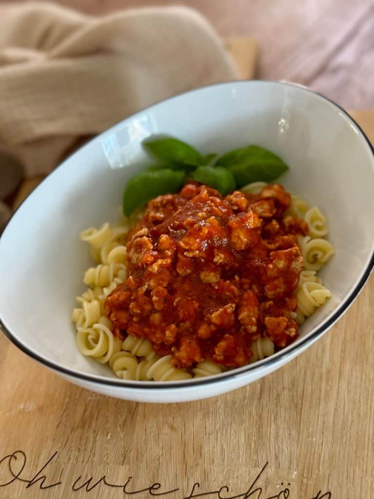 Pasta Bolognese mit Schweinefilet und fruchtiger Tomatensauce